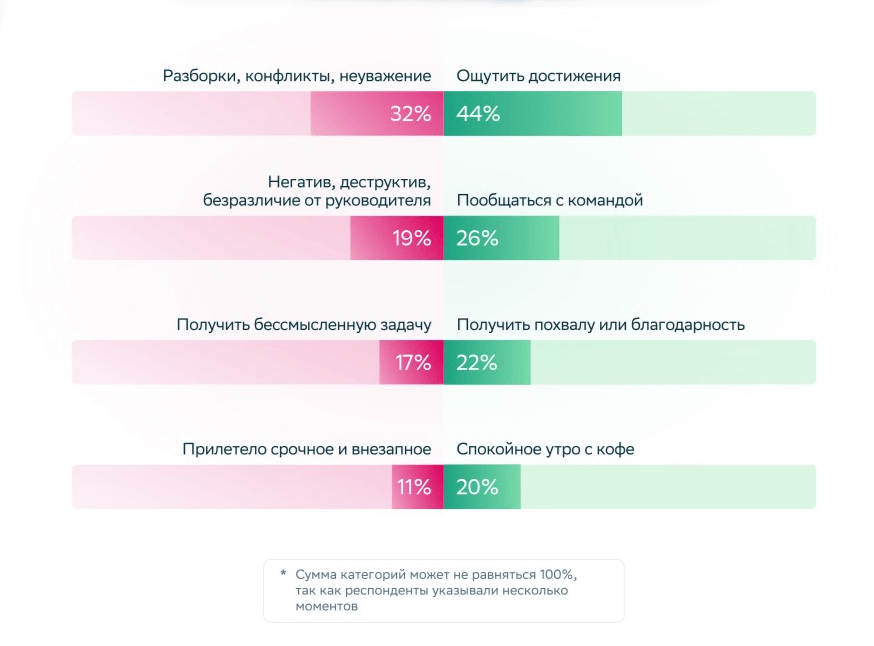 Эксперты СберУниверситета опросили более 400 работников и проанализировали несколько сотен позитивных и  негативных рабочих ситуаций, чтобы понять, как они влияют на продуктивность и мотивацию персонала. Участникам были заданы вопрос — “Какой момент в течение рабочего дня улучшает ваше настроение, а какой — портит ваше настроение?”, а наиболее распространенные ответы приведены на рис. 1.