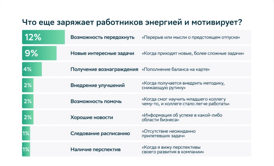Среди менее значимых мотивирующих факторов, представленных на рис. 2, — возможность передохнуть (12%) и новые интересные задачи (9%).