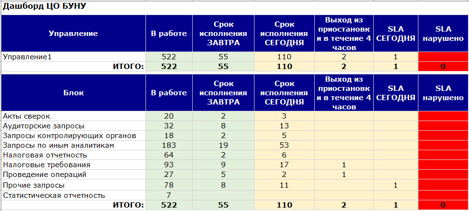 2.Дашборды в разрезе групп и сотрудников. От заказчиков поступают запросы на формирование актов сверки, подбор документов по аудиторским запросам и запросам контролирующих органов. По обращениям устанавливается срок SLA.