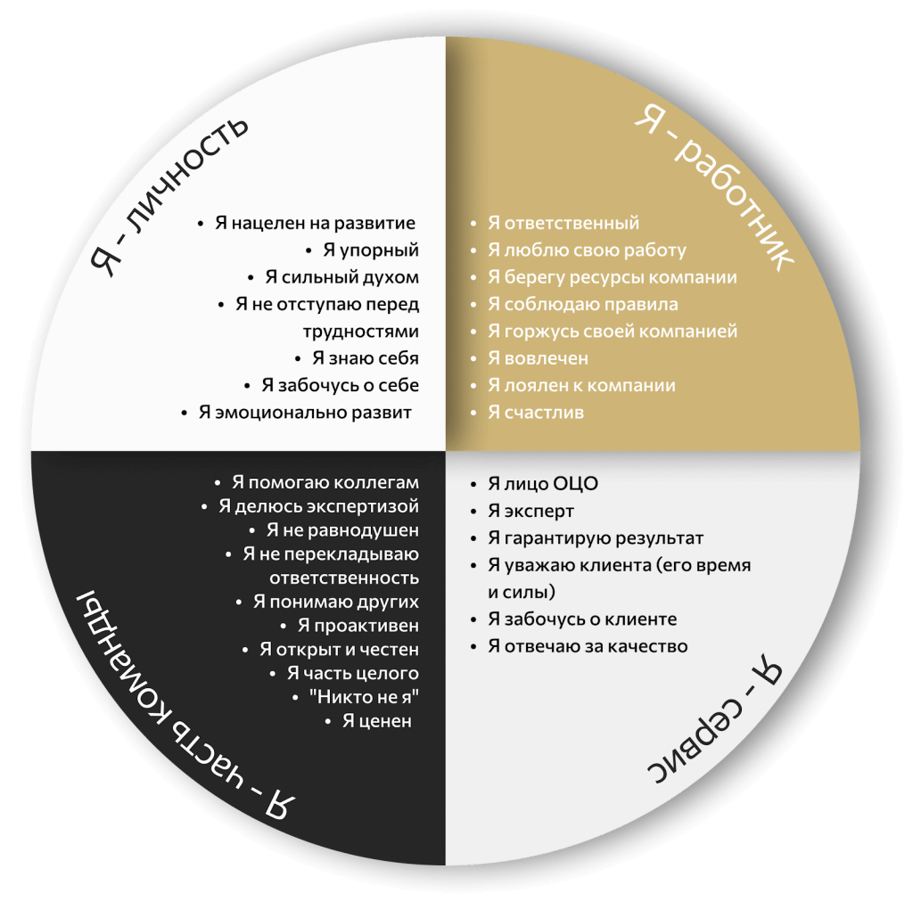 - Я – работник. Это отношение сотрудника к своей работе и компании, осознание ответственности, стремление делать работу хорошо. Если в человеке нет этого внутреннего стремления, его энергия будет направлена на поиск путей для формального выполнения KPI, а не на поиск наилучшего способа выполнения своей работы.